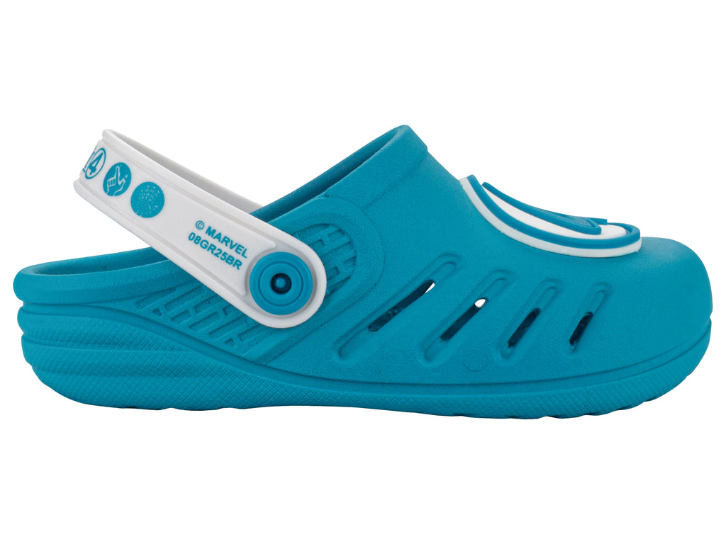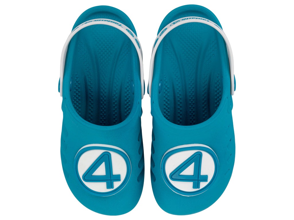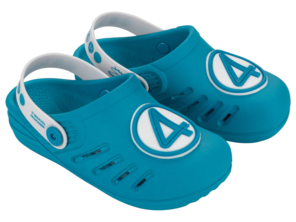 Buscando expandir el universo de los héroes de Marvel, presentamos una babucha con nuevas aplicaciones en plastisol. La idea es trabajar con los íconos característicos de cada personaje, mostrando la araña del uniforme de Spider-Man, el escudo usado por el Capitán América y el logo presente en los uniformes de los miembros de los Cuatro Fantásticos. Además del símbolo distintivo de cada licencia, también incluimos la firma de los personajes en la tira trasera.