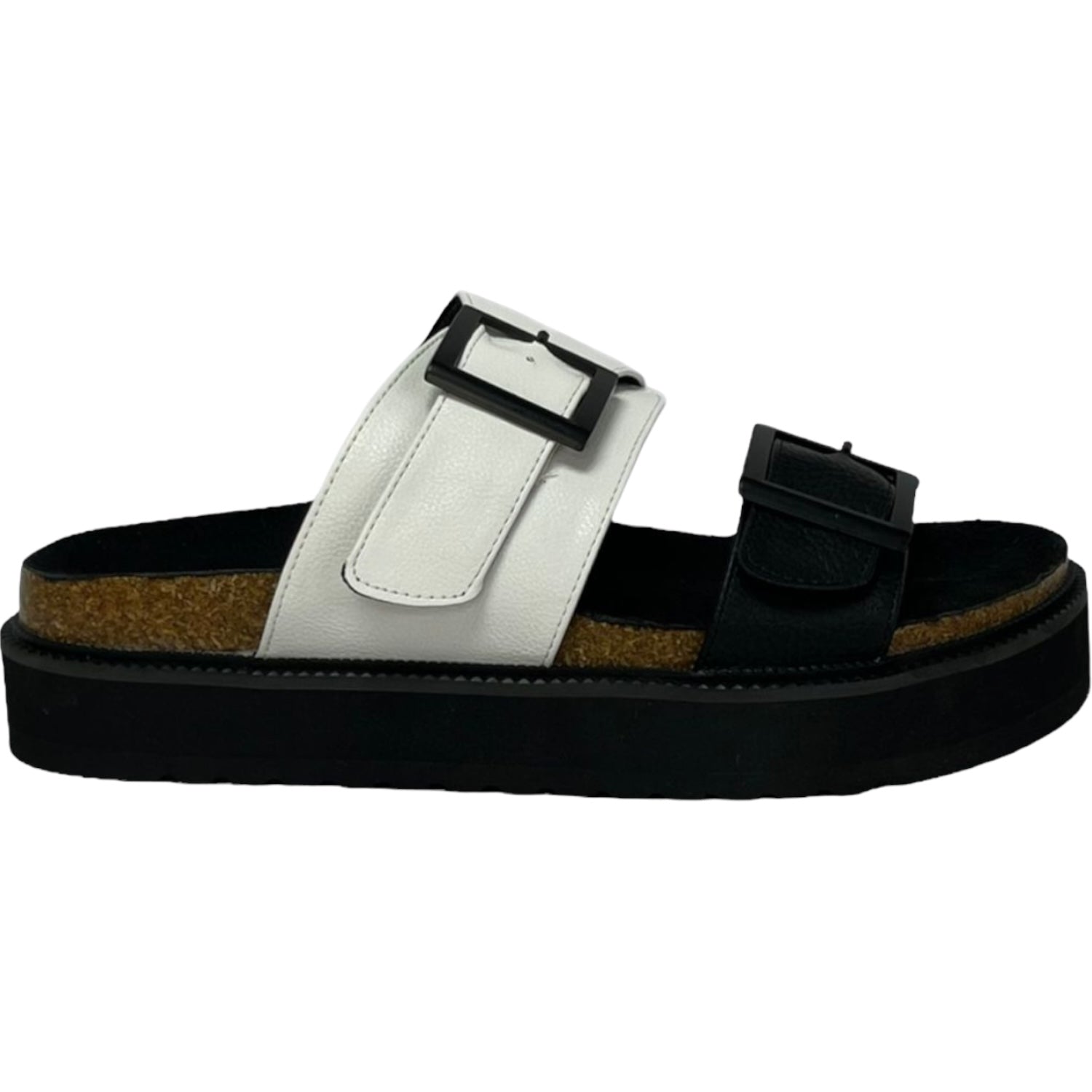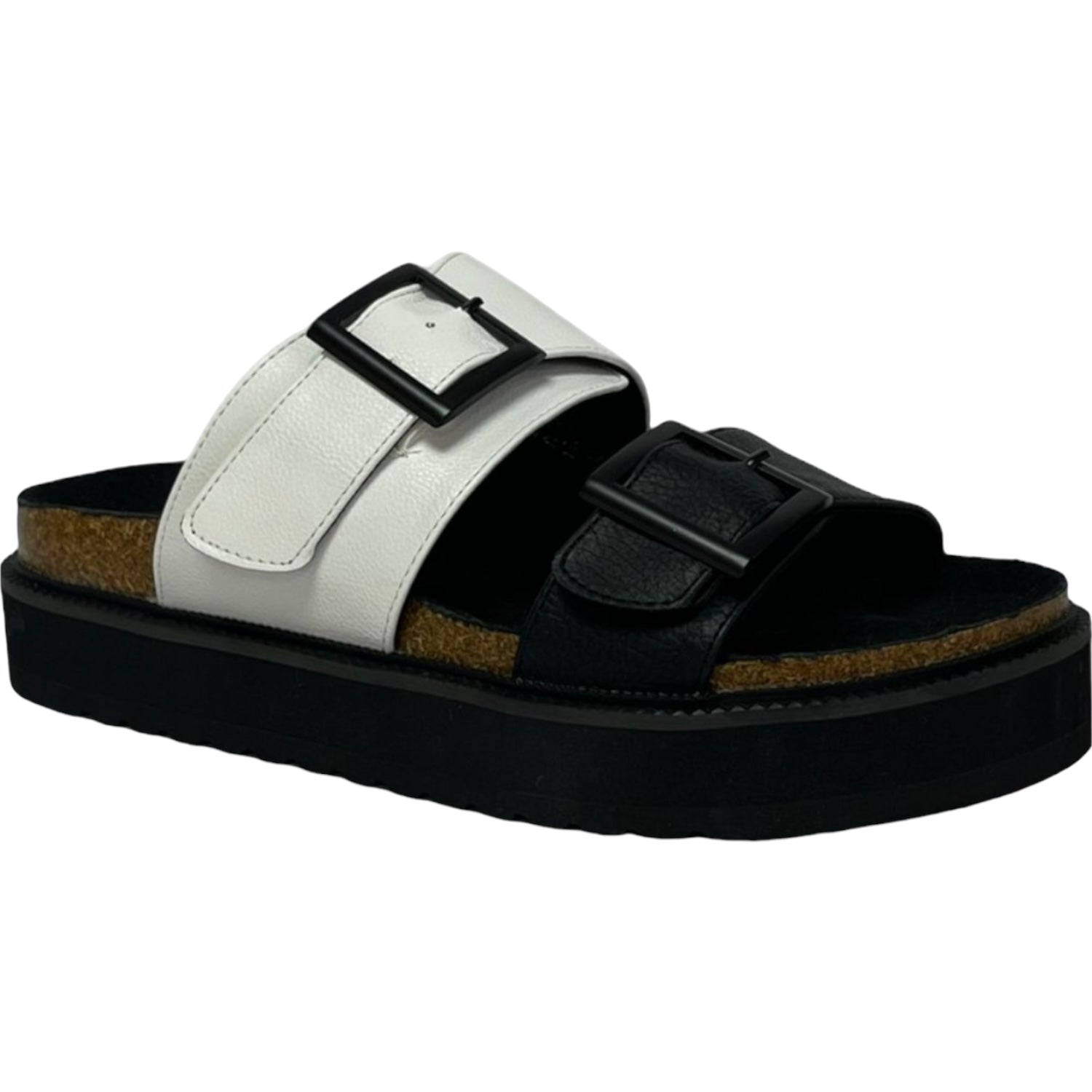 La sandalia Detogni modelo London destaca por su diseño moderno en contraste blanco y negro. Con plataforma de 5 cm y plantilla acolchada, entrega confort y estabilidad en cada paso. Sus dos correas anchas con hebillas metálicas ajustables aportan un estilo urbano y versátil, ideal para acompañar looks casuales con un toque sofisticado.