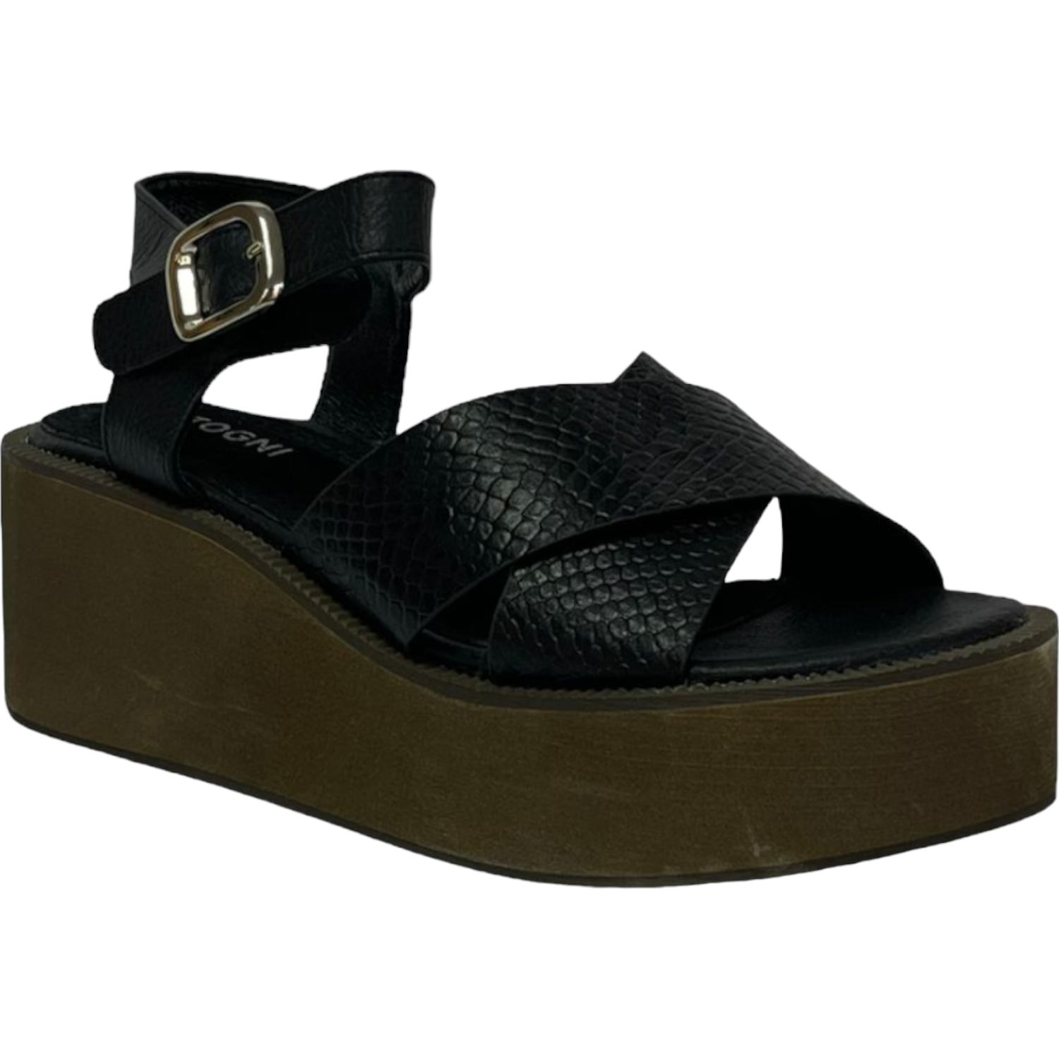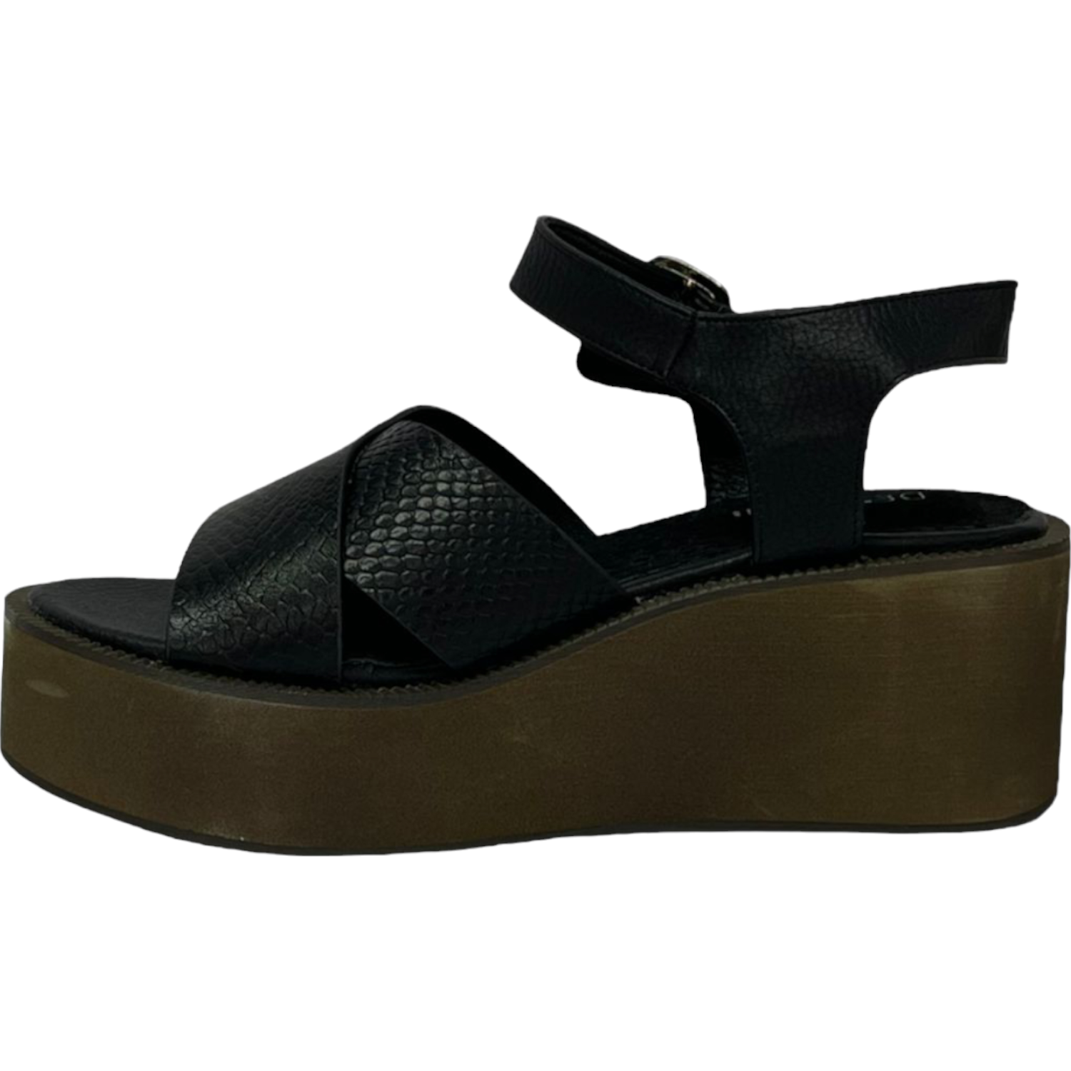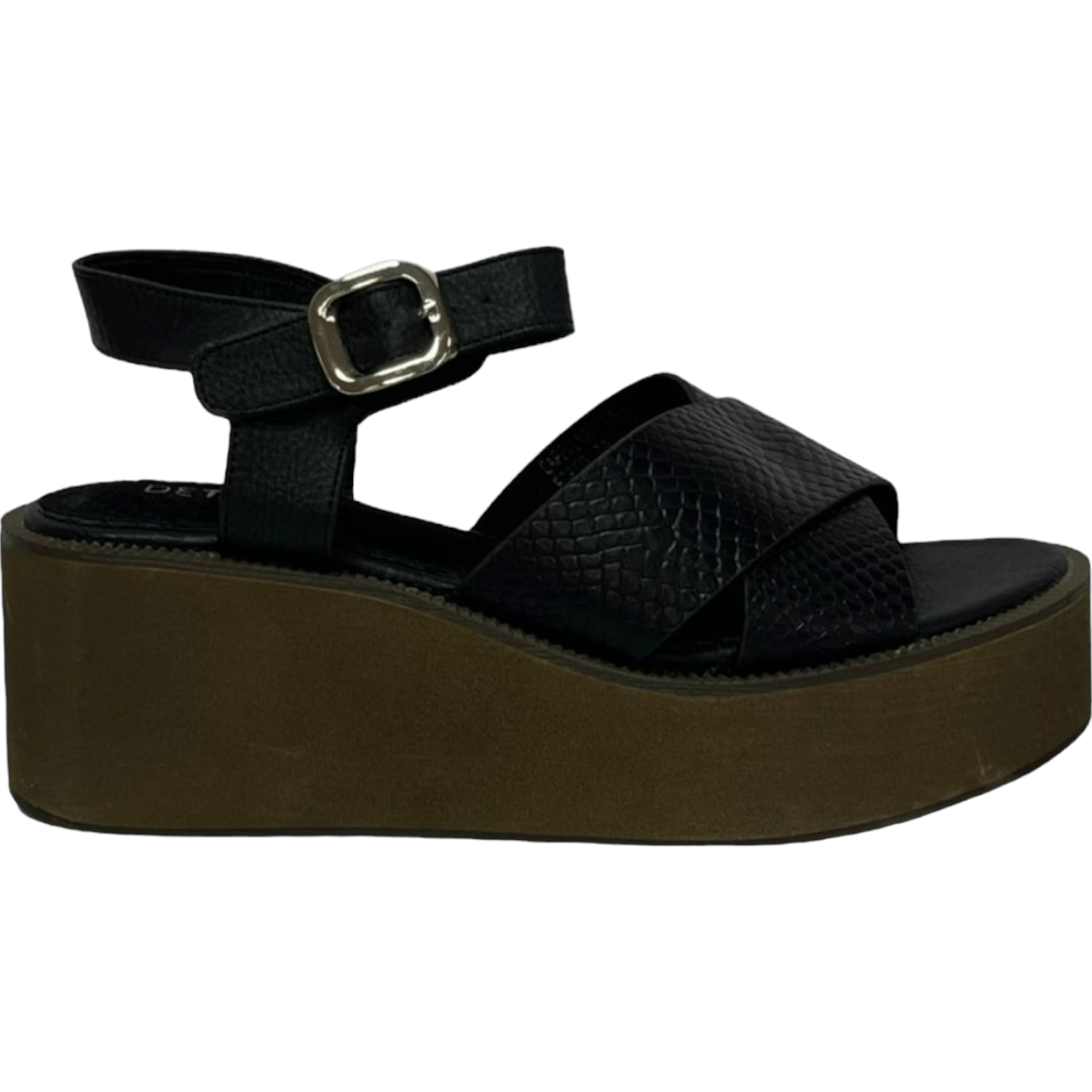 La sandalia cómoda Detogni modelo Balosac en color negro combina estilo sofisticado y confort. Con plataforma de 8 cm y plantilla acolchada, brinda altura y suavidad al caminar. Su diseño con correas cruzadas texturizadas y pulsera ajustable con hebilla metálica la hacen ideal para looks casuales y urbanos con un toque moderno.