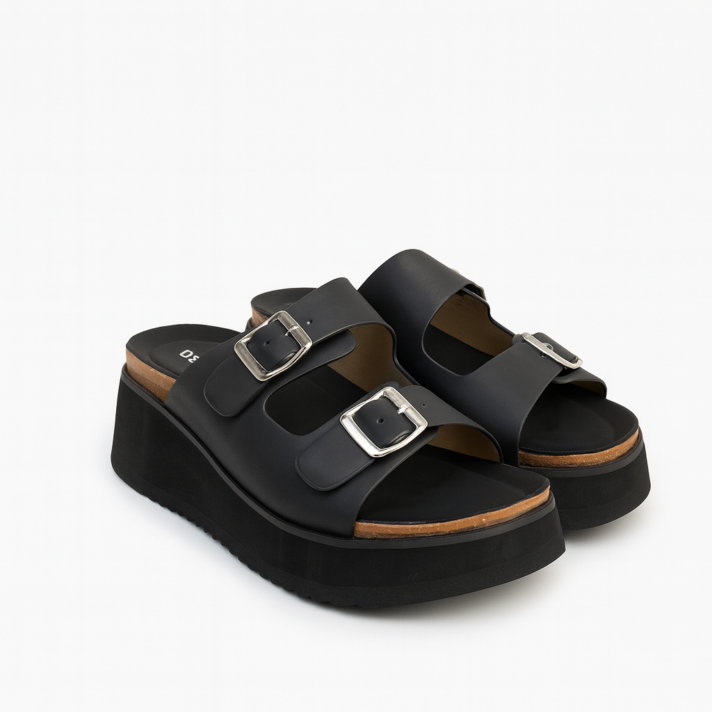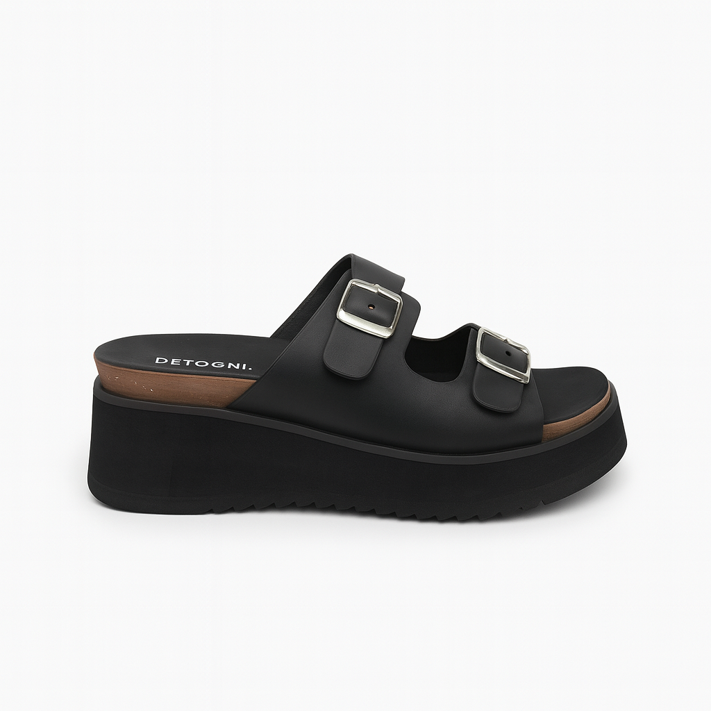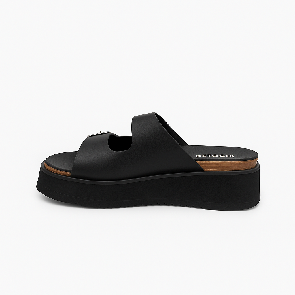 - La sandalia cómoda Detogni modelo Carmen en color negro combina estilo y confort. Con plataforma de 6 cm en EVA y plantilla textil, ofrece estabilidad y suavidad al caminar. Su diseño con doble correa ajustable y hebillas metálicas le da un look moderno y versátil, ideal para complementar outfits casuales y frescos.