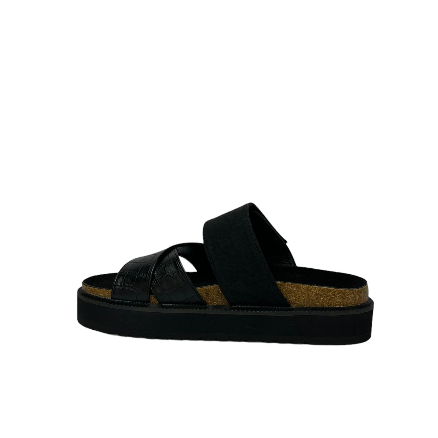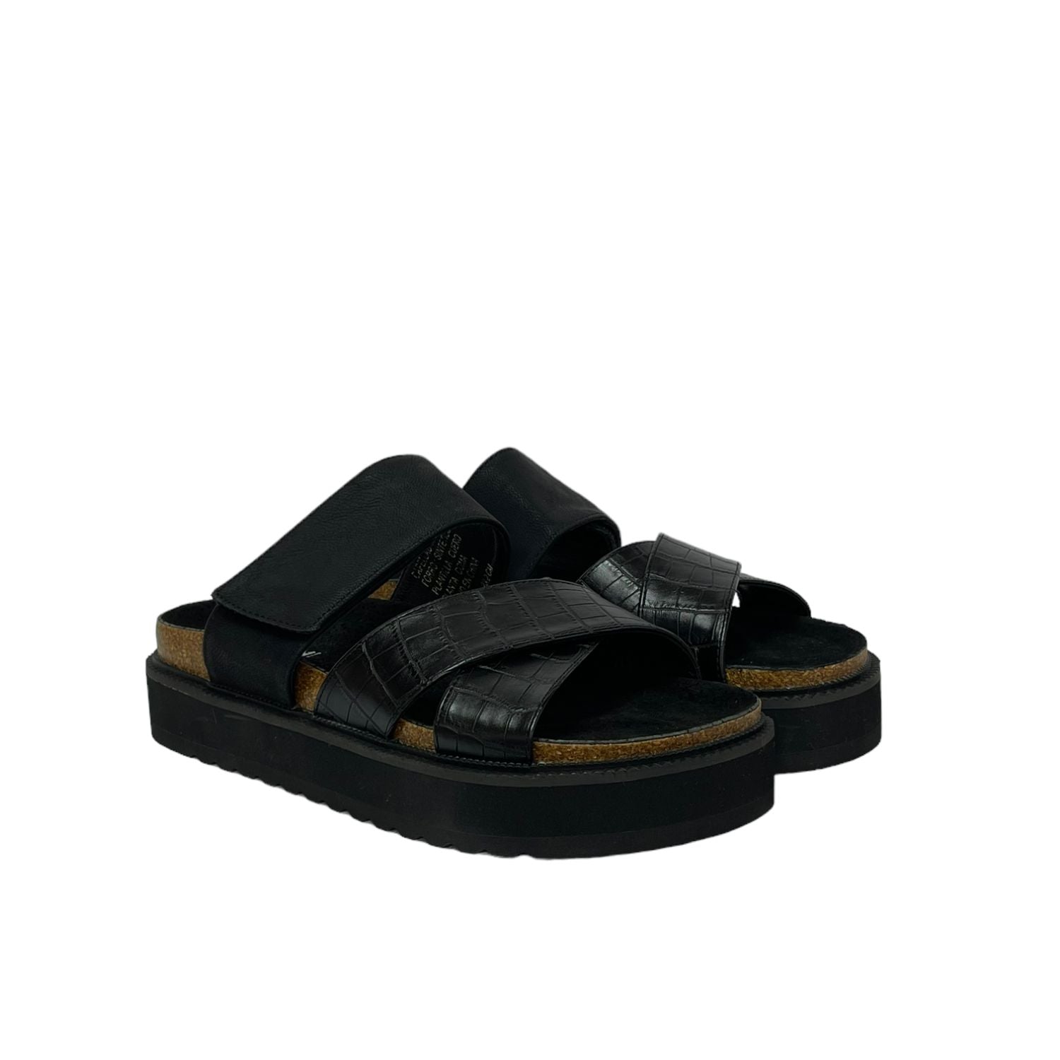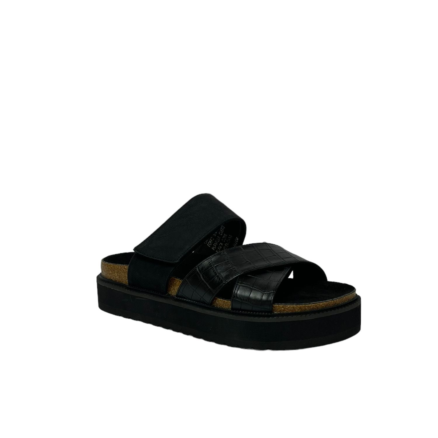 La sandalia cómoda Detogni modelo Copa en color negro combina modernidad y confort. Con suela de 5 cm, aporta estabilidad y altura ligera. Su diseño de doble correa ancha con acabado reptilado y cierre ajustable garantiza un calce seguro, mientras que la plantilla acolchada brinda suavidad en cada paso.