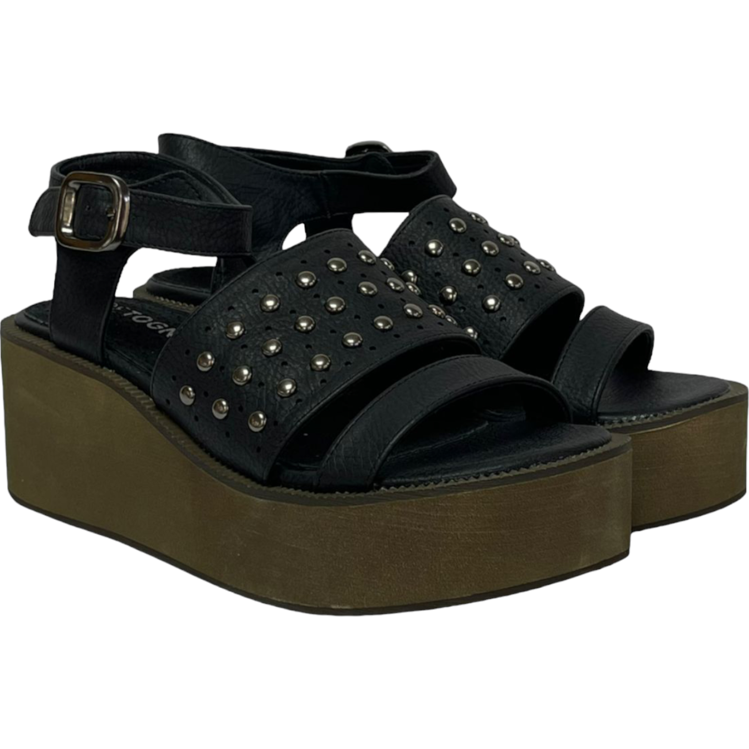 La sandalia Detogni modelo Lugo en color negro combina estilo moderno y confort. Con plataforma de 8 cm y plantilla acolchada, ofrece altura y suavidad al caminar. Su diseño con correas anchas adornadas con tachas metálicas y pulsera ajustable con hebilla aporta un look urbano y versátil, ideal para destacar en tus outfits casuales.