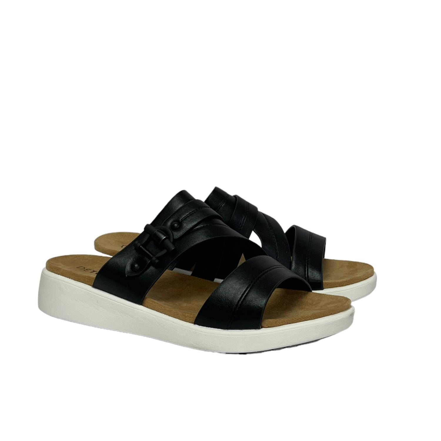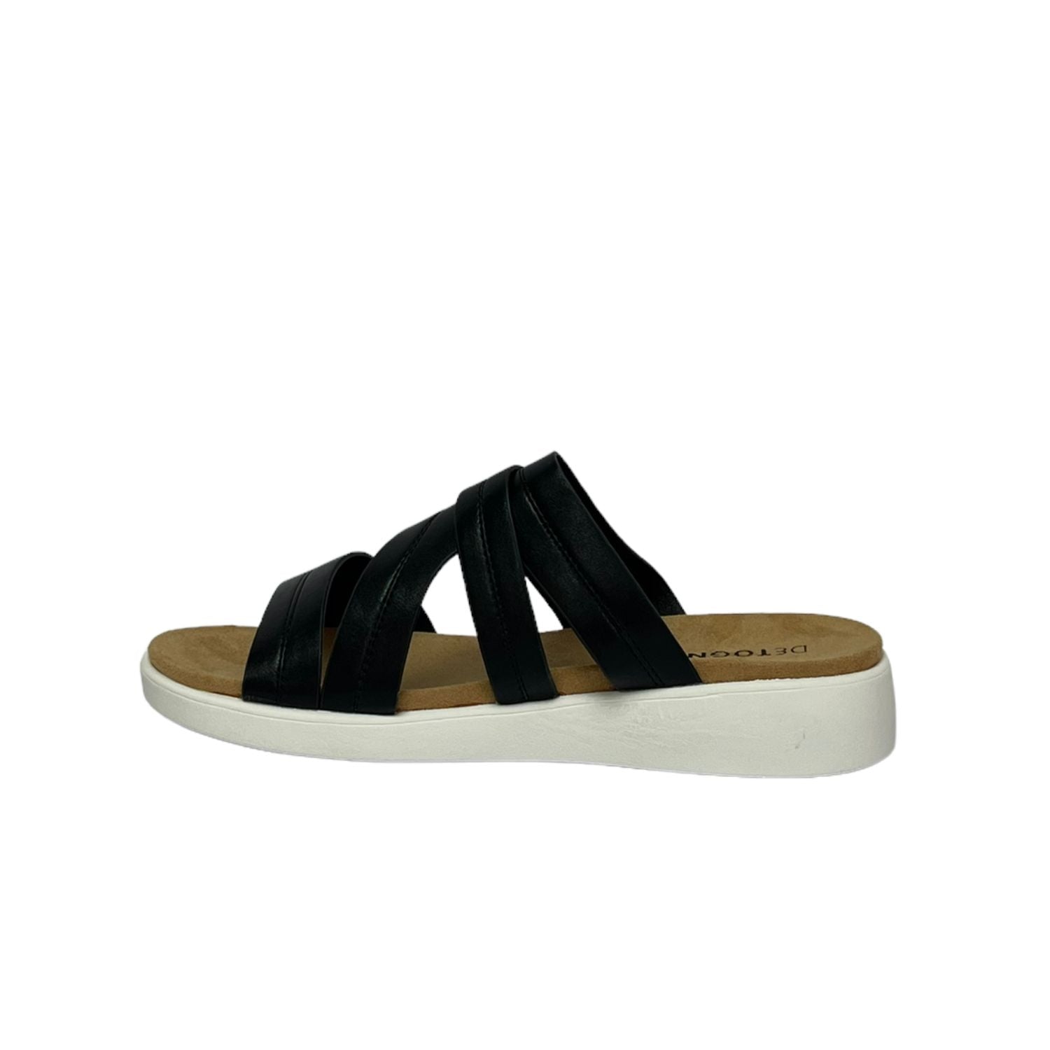 - La sandalia cómoda Detogni modelo Marta en color negro combina sencillez y confort. Con suela liviana de 4 cm y plantilla acolchada, brinda suavidad y estabilidad en cada paso. Su diseño de correas cruzadas con hebilla lateral aporta un estilo versátil y casual, ideal para uso diario.