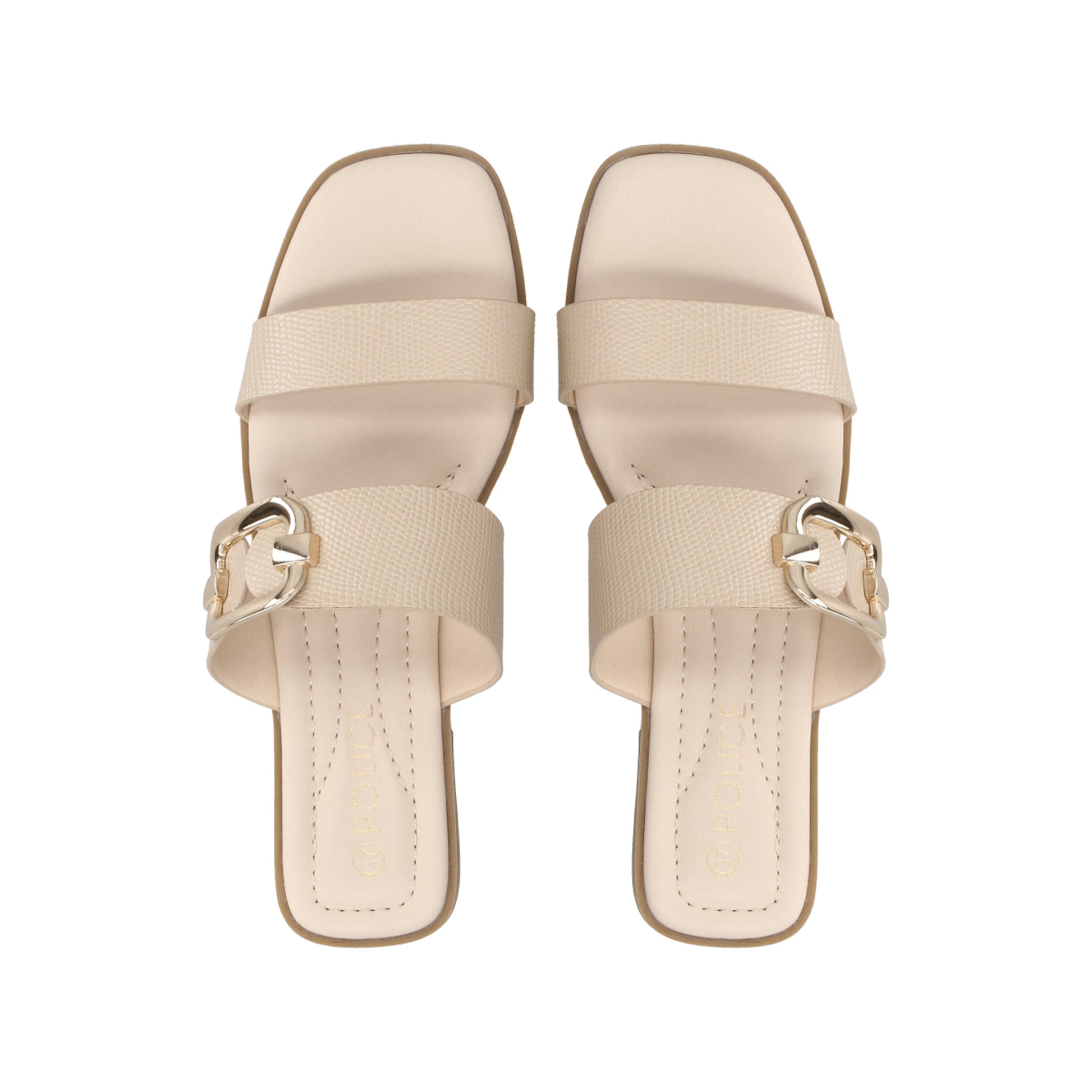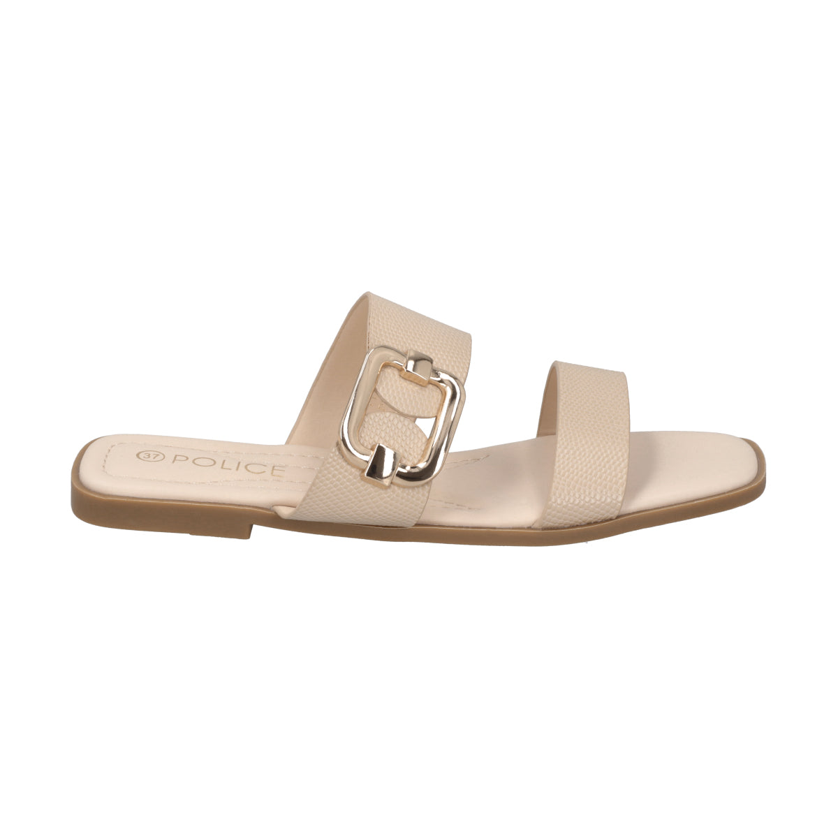 La sandalia es un básico elegante que eleva cualquier look sin perder comodidad. Su diseño minimalista con tiras texturadas y una hebilla metálica dorada aporta un punto sofisticado y moderno, ideal tanto para la oficina como para salidas casuales.