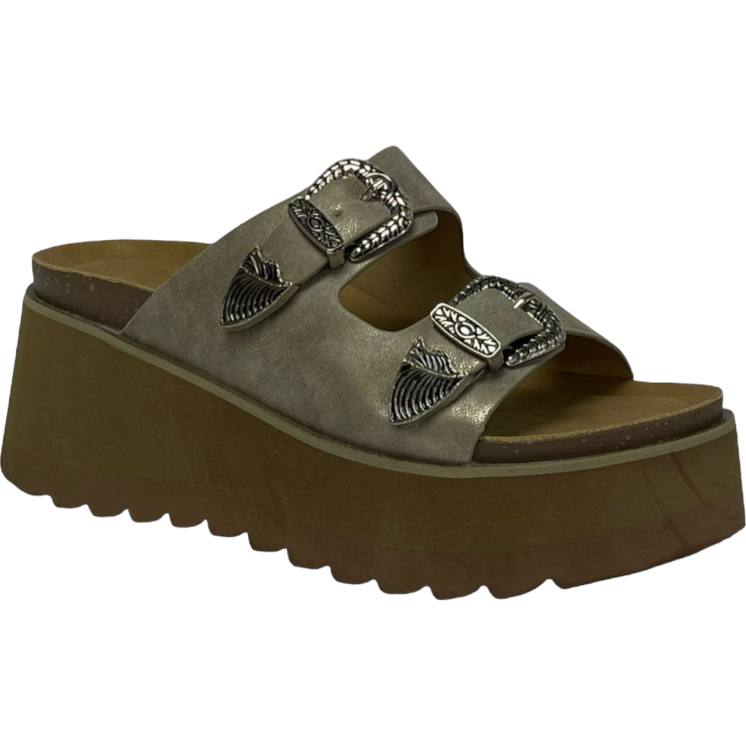 La sandalia cómoda Detogni modelo Orquídea resalta por su diseño atrevido y moderno. Con plataforma de 7 cm , brinda altura y estabilidad sin perder confort. Sus dos correas con hebillas metálicas decorativas aportan estilo único, ideal para looks casuales con personalidad.