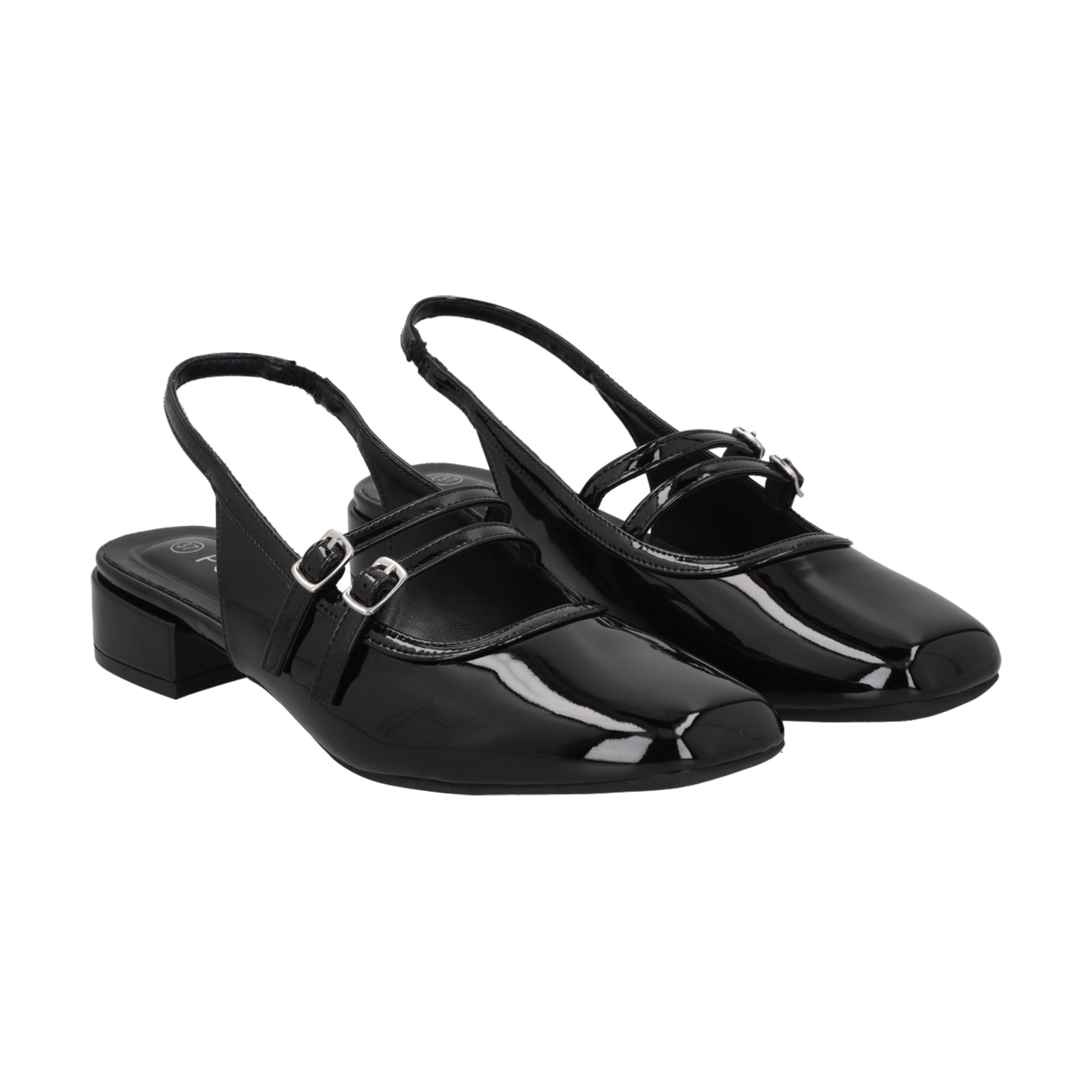 Zapato bajo tipo slingback en charol, femenino y pulido. Tiene dos tiras sobre el empeine que aportan estilo y ajuste, perfecto para oficina o eventos casuales.Ideal para sumar altura sin perder estabilidad. Tiene dos tiras acolchadas y respaldo tipo sling con hebilla, que la hacen fácil de poner y muy femenina para looks urbanos y de oficina.