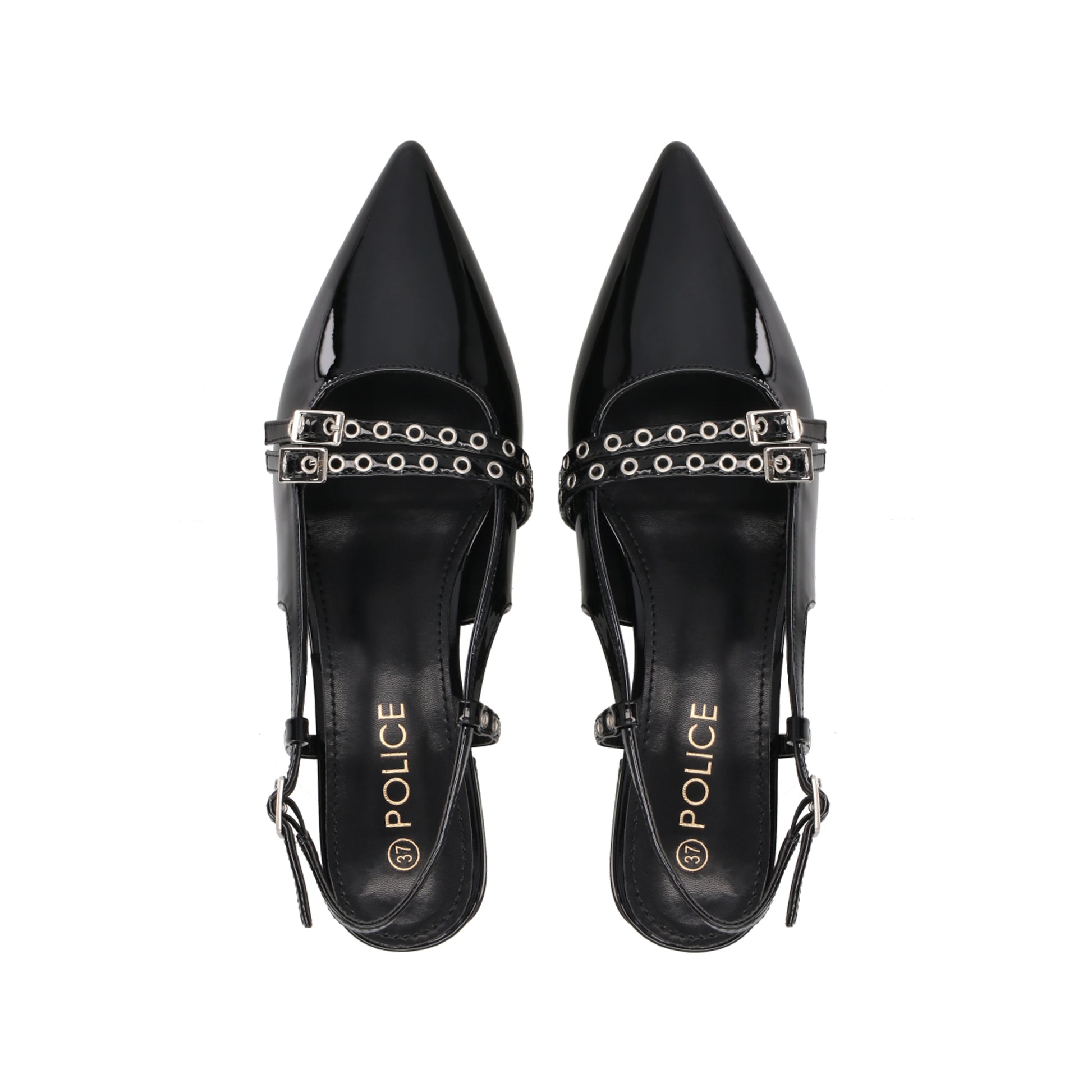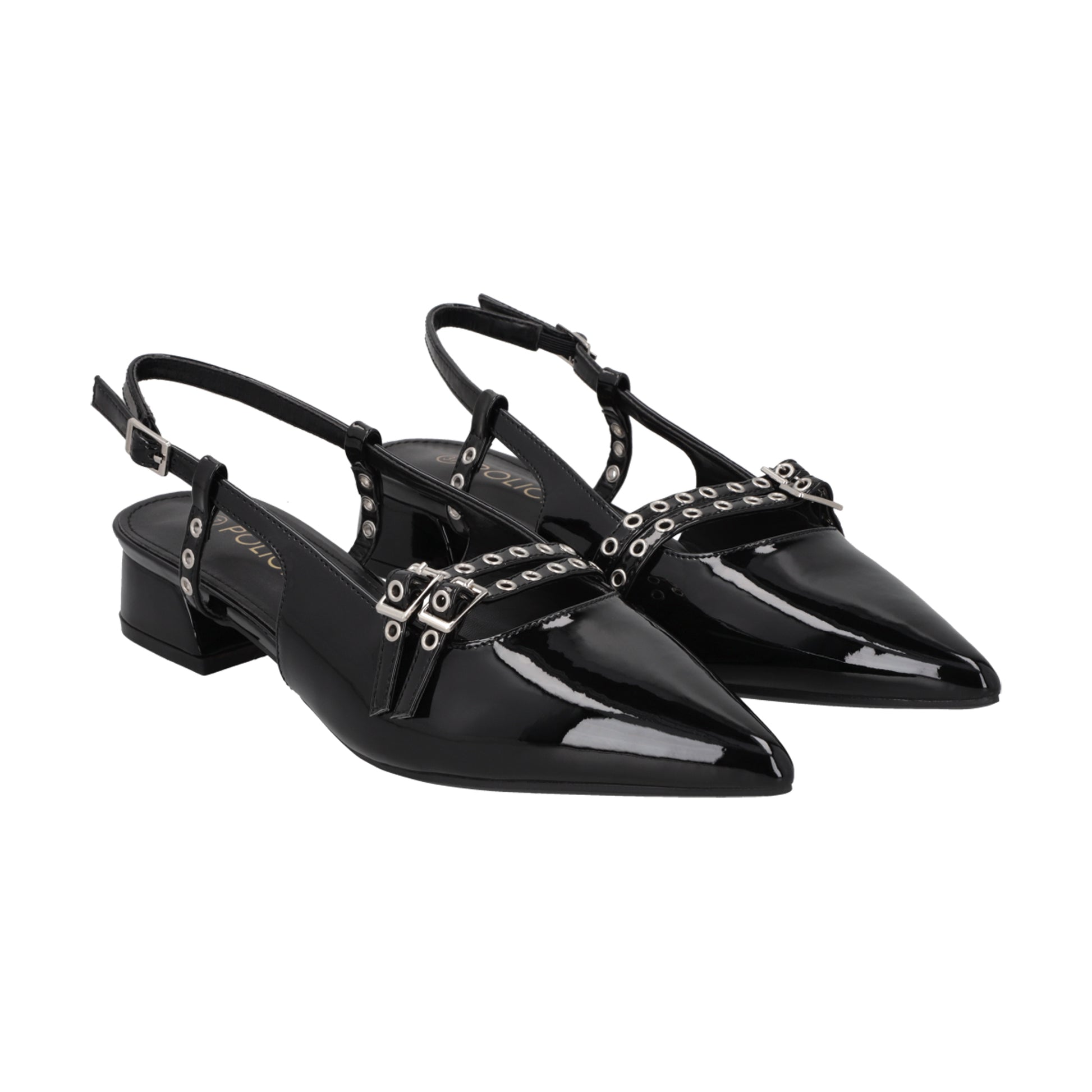 Las tiras con tachas y ojales metálicos le dan personalidad y un aire moderno, creando un balance ideal entre sofisticación y actitud. El diseño slingback mantiene el pie sujeto con comodidad, y su pequeño tacón cuadrado permite usarlo durante todo el día sin cansancio. Perfecto para outfits de oficina con carácter, cenas, eventos o looks minimalistas que necesitan un detalle protagonista.